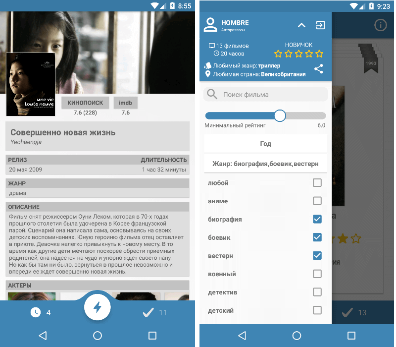 • Добавляйте фильмы, которые Вы видели, в список просмотренных простым взмахом вправо, либо в список отложенных к просмотру взмахом влево
